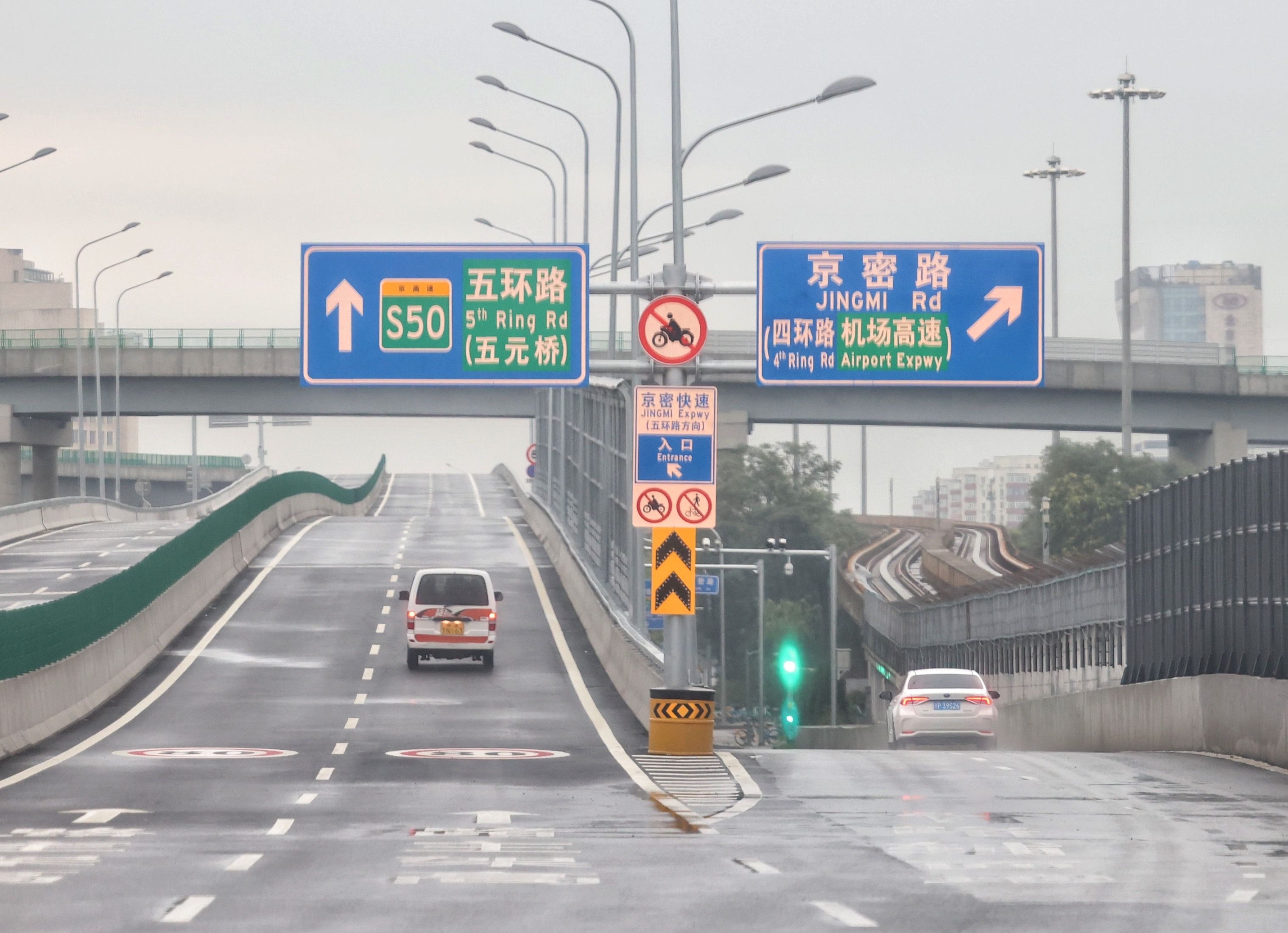 新京报讯(记者裴剑飞)继机场高速、京承高速之后,北京又增添了一条东北方向的交通大动脉。本周六起,京密路(太阳宫北街-机场南线)道路工程完工通车,这条全新升级后的城市快速路位于既有京密路的上方,今早记者驾车体验后发现,从太阳宫北街到机场南线行驶完全程只需要15分钟。