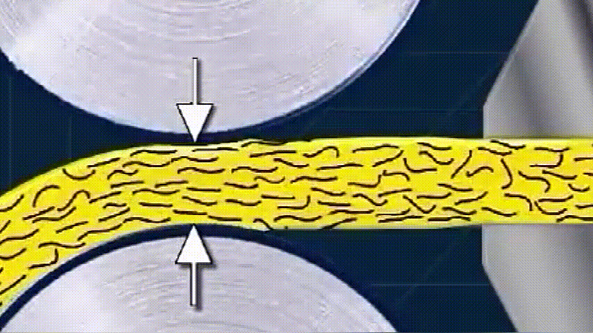 然后再送入两个辊压机之间,通过压力将熔化的塑料压平,变成均匀的薄片,然后将片材冷却,从而使亚克力片材固化。