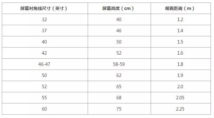目前大多数的屏幕比例为16:9,所以采用换算方式:屏幕高度=对角线(我们常说的屏幕尺寸)x 0.4903,再进行单位换算,屏幕高度(cm)= 屏幕高度(英寸)x 2.54,观看距离(cm) = 屏幕高度(cm)x 3,得出以上电视尺寸与观看距离推荐表。