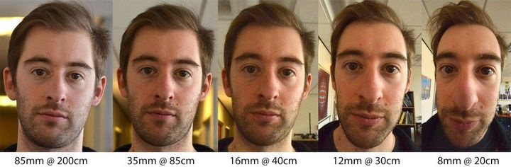 当我们拿手机自拍时,一般距离为24~35mm,因为近大远小的透视原因,就会让我们的面部中间被放大,边缘收窄。