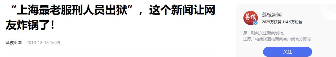 原文登载于荔枝新闻 2018年12月16日关于“上海最老服刑人员出狱”,这个新闻让网友炸锅了!的报道