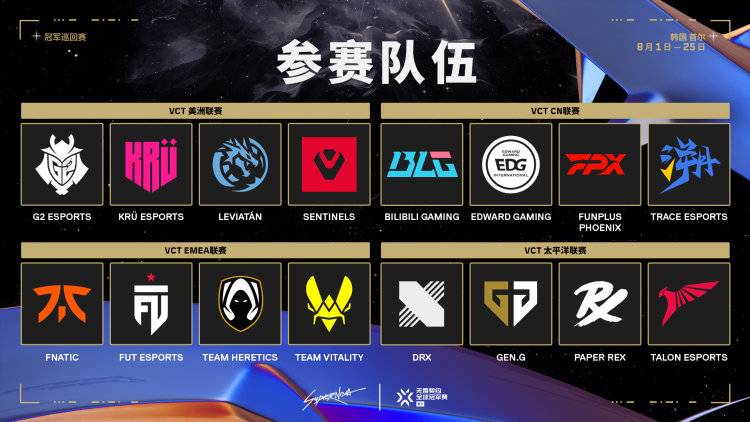 8 月 1 日至 25 日,参赛队伍将从小组赛阶段一路挺进双败淘汰制的淘汰赛阶段,并通过总决赛选出下一位无畏契约世界冠军。