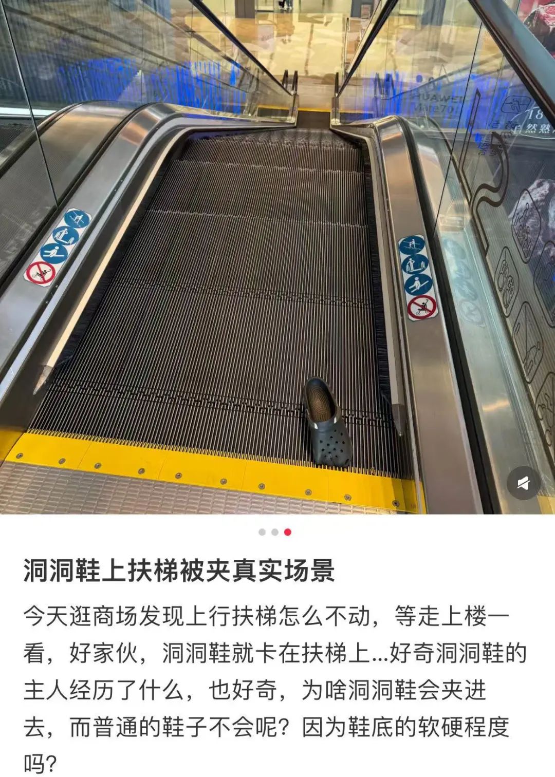 由于洞洞鞋鞋头宽大(比正常的鞋子约宽 20%),为了保证舒适度,塑料很厚,鞋面很高,所以即使是站在正常位置,鞋头距离两个电梯台阶之间的锯齿部位也比正常的鞋子近很多。