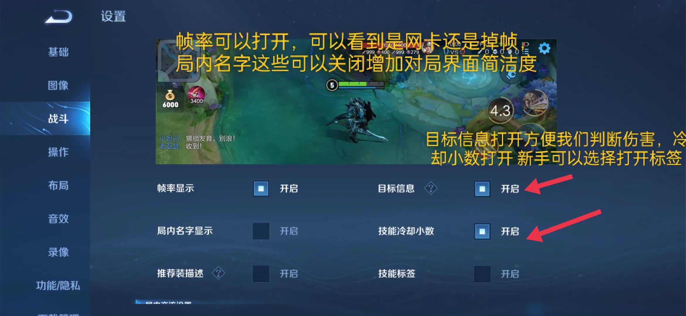 同样技能冷却小数打开,好为我们打出极限操作铺垫,局内名字和标签关闭,增加局内简洁度。
