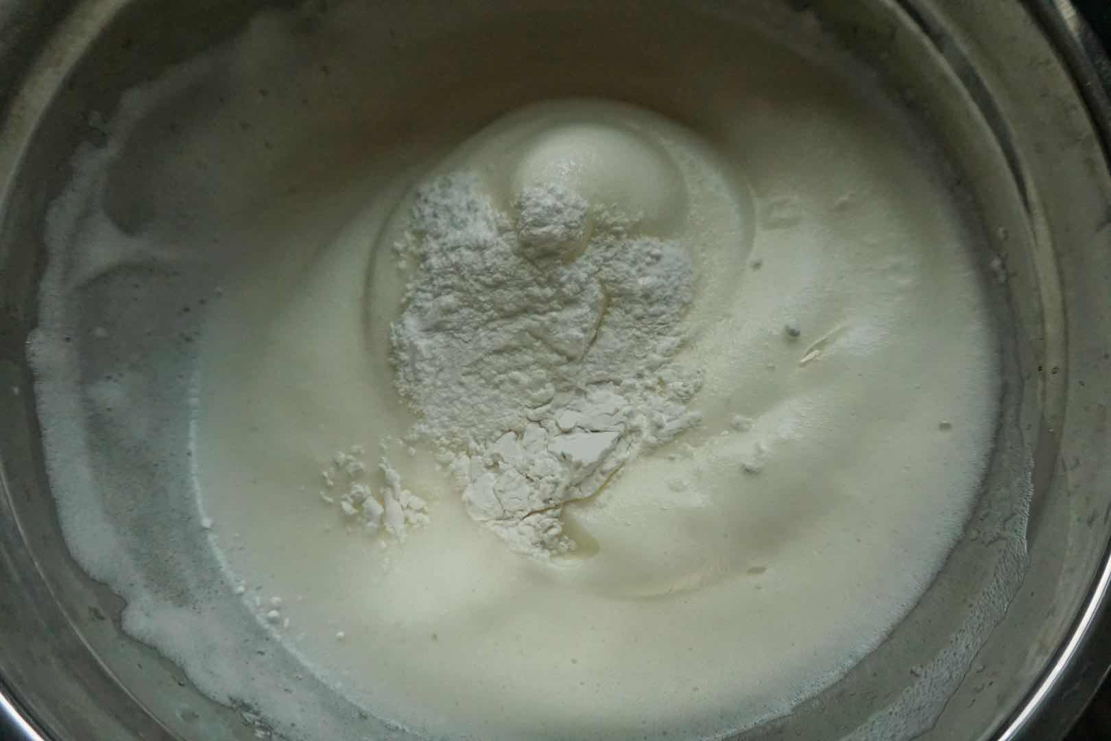 3、最后一次加入糖粉和玉米淀粉一起加入,用打蛋器打至硬性发泡即可
