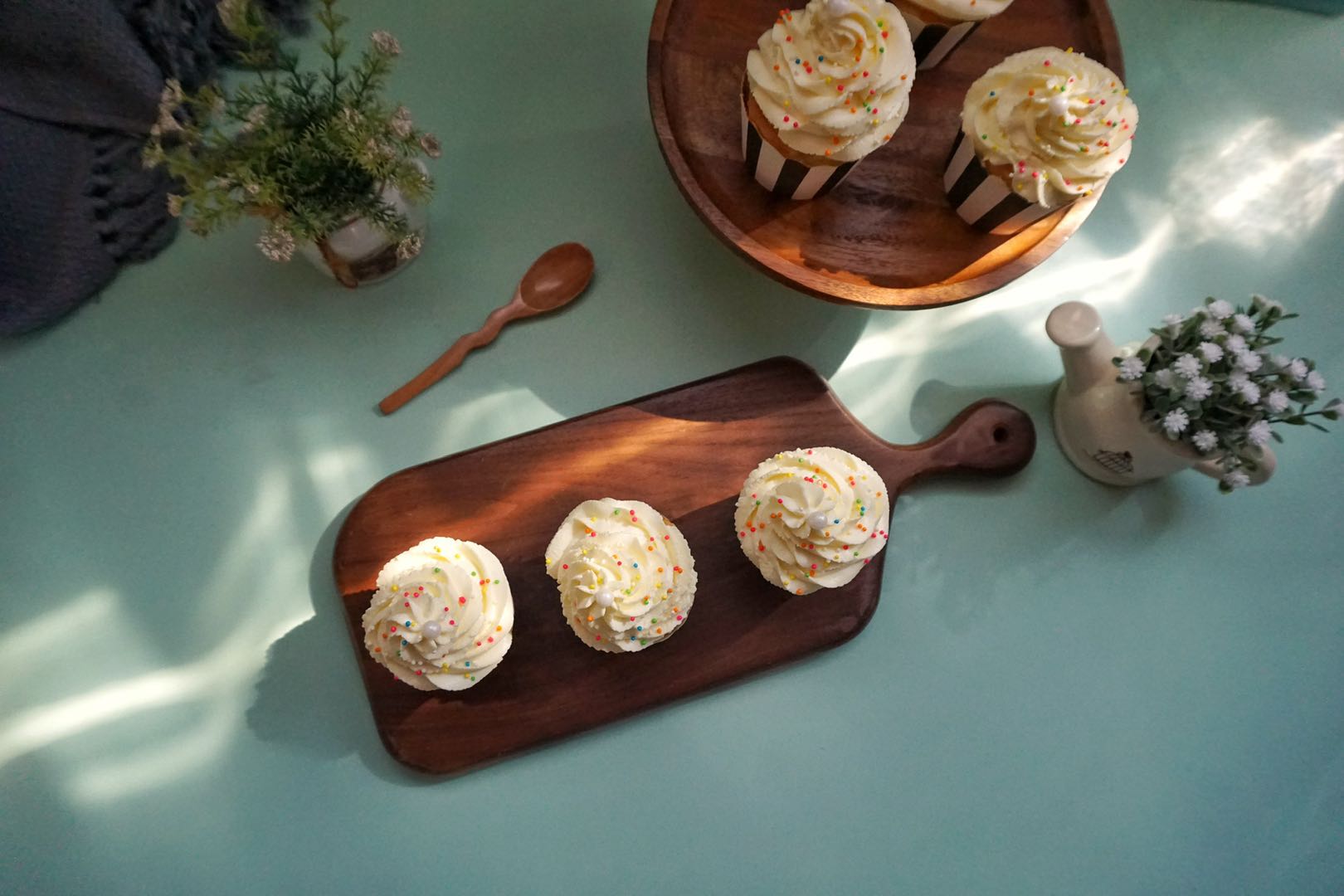 【奶油杯子蛋糕】低筋面粉45克,糖粉40克,纯牛奶35克,植物油30毫升,鸡蛋4个,柠檬汁几滴,玉米淀粉10克,淡奶油400毫升,糖粉80克,糖珠适量