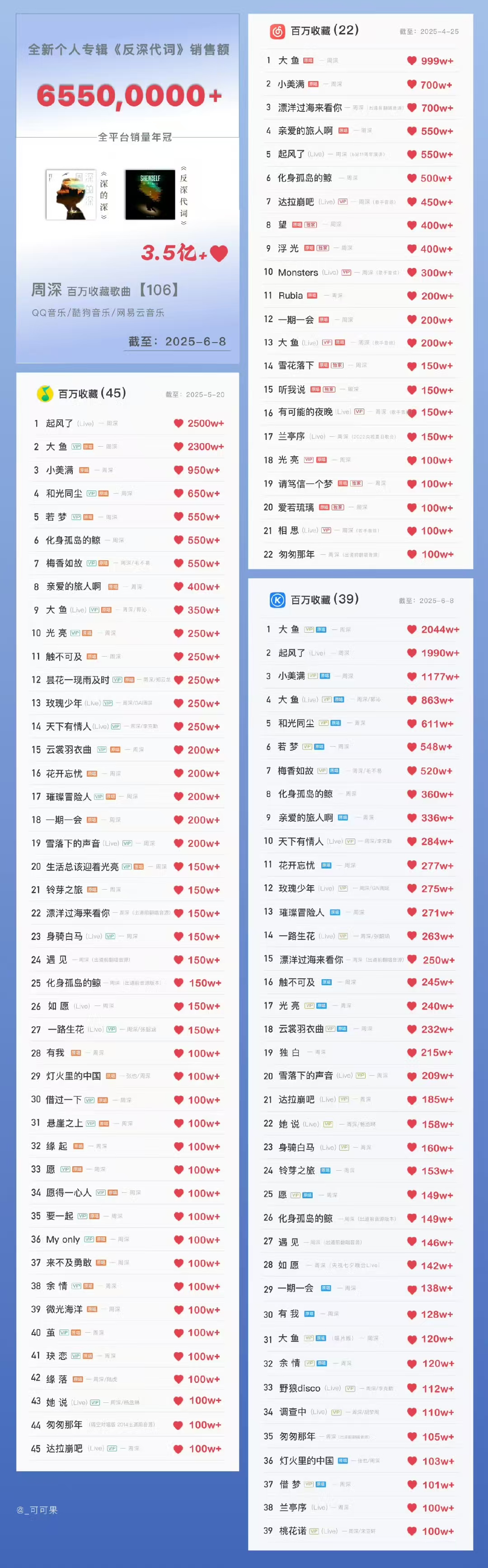 据周深歌迷统计,截止2025年6月8日,周深单个音乐平台收藏超百万的歌曲已超过一百首,而数字专辑《反深代词》的销售额已经超过6500万元!周深确实是当之无愧的实力与流量并存的顶级巨星!