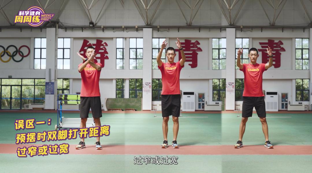 ① 预摆时两脚左右开立,与肩同宽;