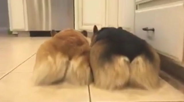 两只狗狗整齐的排着,模样好似古代臣子叩见皇帝时候行的大礼。你家主人只是做顿饭菜而已,就算你们心存感激,也无需如此。还是说案板傻瓜切的洋葱,把狗狗给熏到了?