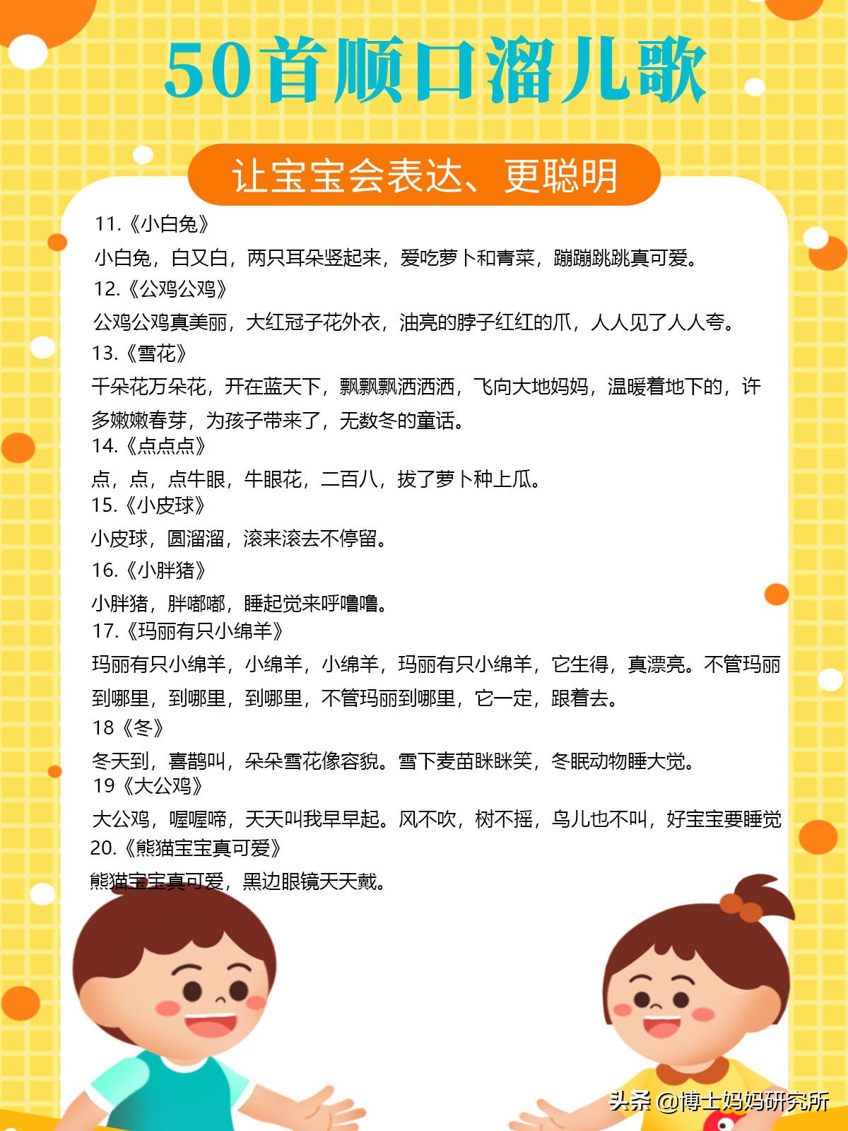 下面是50首朗朗上口的儿歌顺口溜,孩子一听就爱上表达。家长可以先收藏,打印出来,每天学一点,充实孩子的语言库吧!