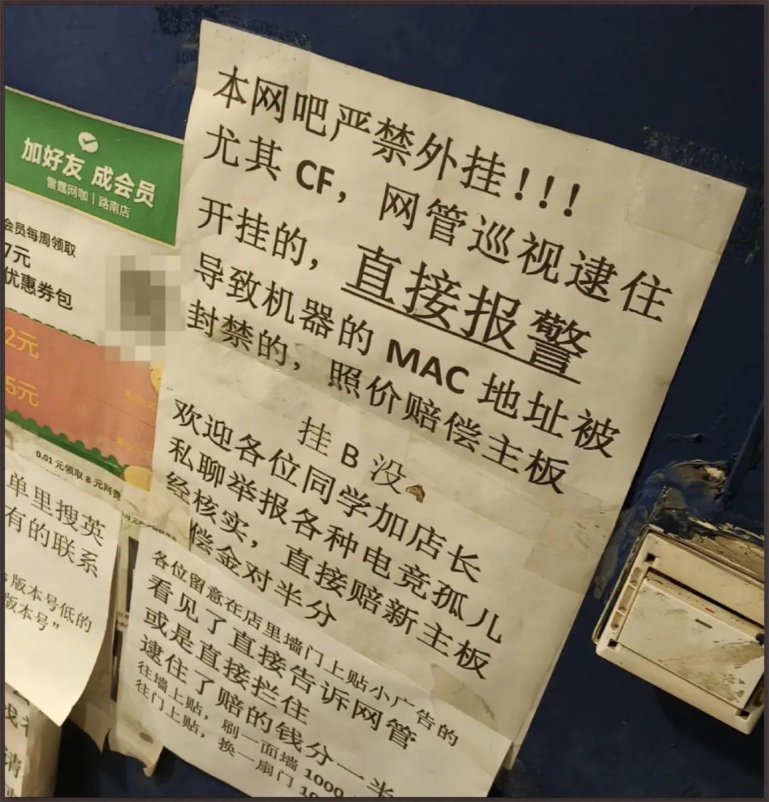 一些地方的网吧也会张贴告示:“店里监控无死角,发现开挂直接报警,本人必须全额买走机器”——主板被封机器码就没法玩了。