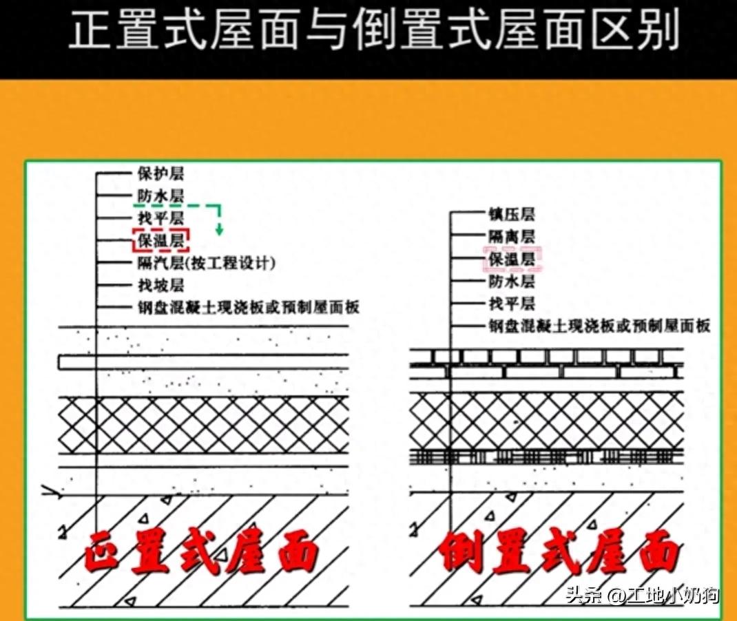 从上图也可以看出最主要区别在于保温层和防水层的相对位置哪个在上哪个在下。