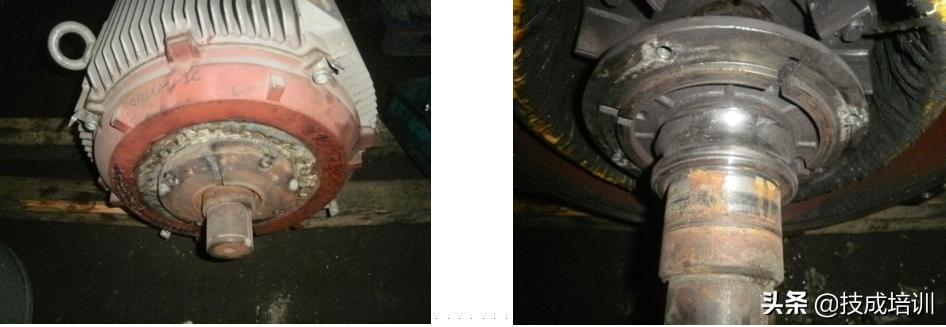 轴承受力异常(如皮带轮或联轴器安装调整不当导致的径向力或轴向力过大),破坏润滑,磨损加剧,导致轴承过热;(如图所示:轴承过载导致风扇烧融;润滑失效、轴承散架)