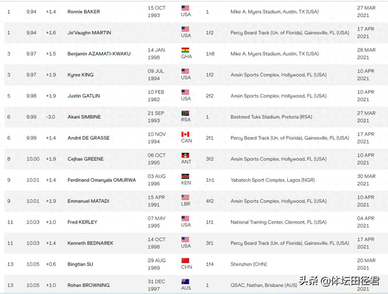 南非西比尼、加拿大格拉斯都跑出9秒99赛季个人最佳,排名世界第六、第七位,安提瓜和巴布达选手格林以10秒00排名世界第八,来自长跑王国肯尼亚的欧曼亚拉在3月创造全国纪录10秒01,排名世界第九,利比里亚马塔迪以10秒01排名世界第十,追平他保持的全国纪录。