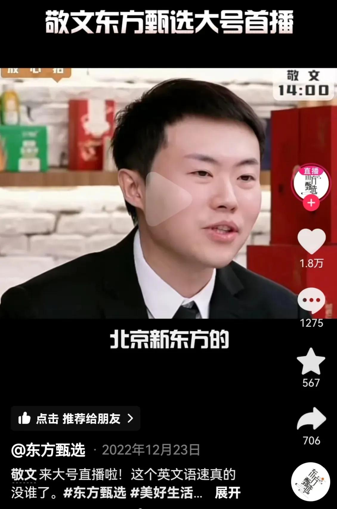 2022年12月23日,敬文在东方甄选大号首播,明明和他进行交班,两位年龄相近的人从此成为知心好友。