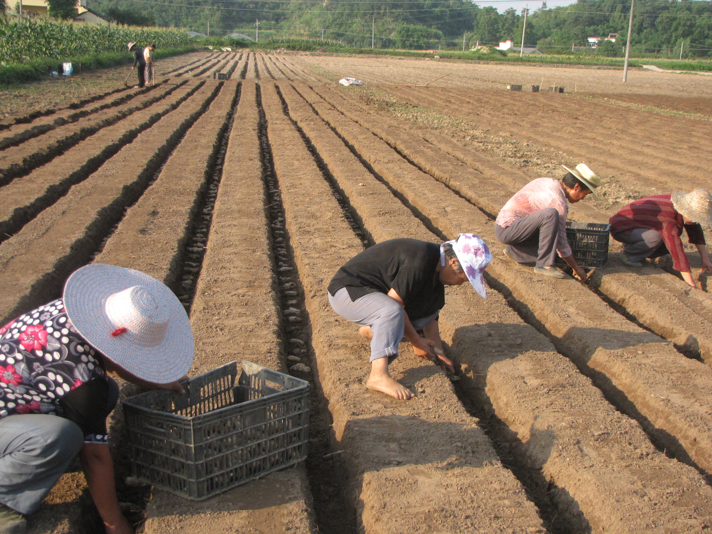 干播,即在播种之前不浇水,先向姜沟内撒施少量化肥和干粪,覆盖2~3厘米的细土,然后再行播种。播后覆盖3~5厘米细土,再淋粪水或清水。干播的优点在于播前不浇水,便于规模化放种,可以节约部分劳力,缺点是一次淋水不容易淋透,这种方法多见于规模种植生姜的大户和业主。开沟的行距一般为50厘米,株距为15~20厘米。为了便于田间管理,播种的姜种应平放于沟底,姜芽朝向一致。