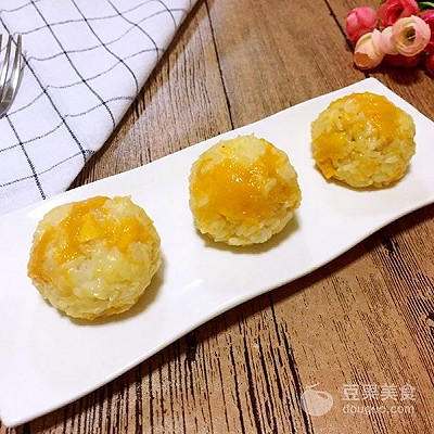 9、等凉到不烫手时,带一次性手套取适量的糯米芒果揉成圆形。也可以直接食用