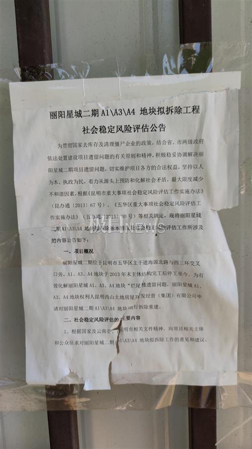 谈及15栋烂尾楼即将爆破的消息,附近居民还是略有担心,“主要是怕爆破时声音及灰尘太大、飞石砸到自家玻璃,影响现有房屋地基。”但也有附近商户认为,政府既然有决心实行爆破,应该是有充足的准备方案,影响估计不大。极目新闻记者发现,附近一小区围栏上贴有“丽阳星城二期A1\A3\A4地块拟拆除工程社会稳定风险评估公告”,向群众征求意见,该公告系昆明市五华区人民政府黑林铺街道办事处发布,落款日期为2021年4月16日。