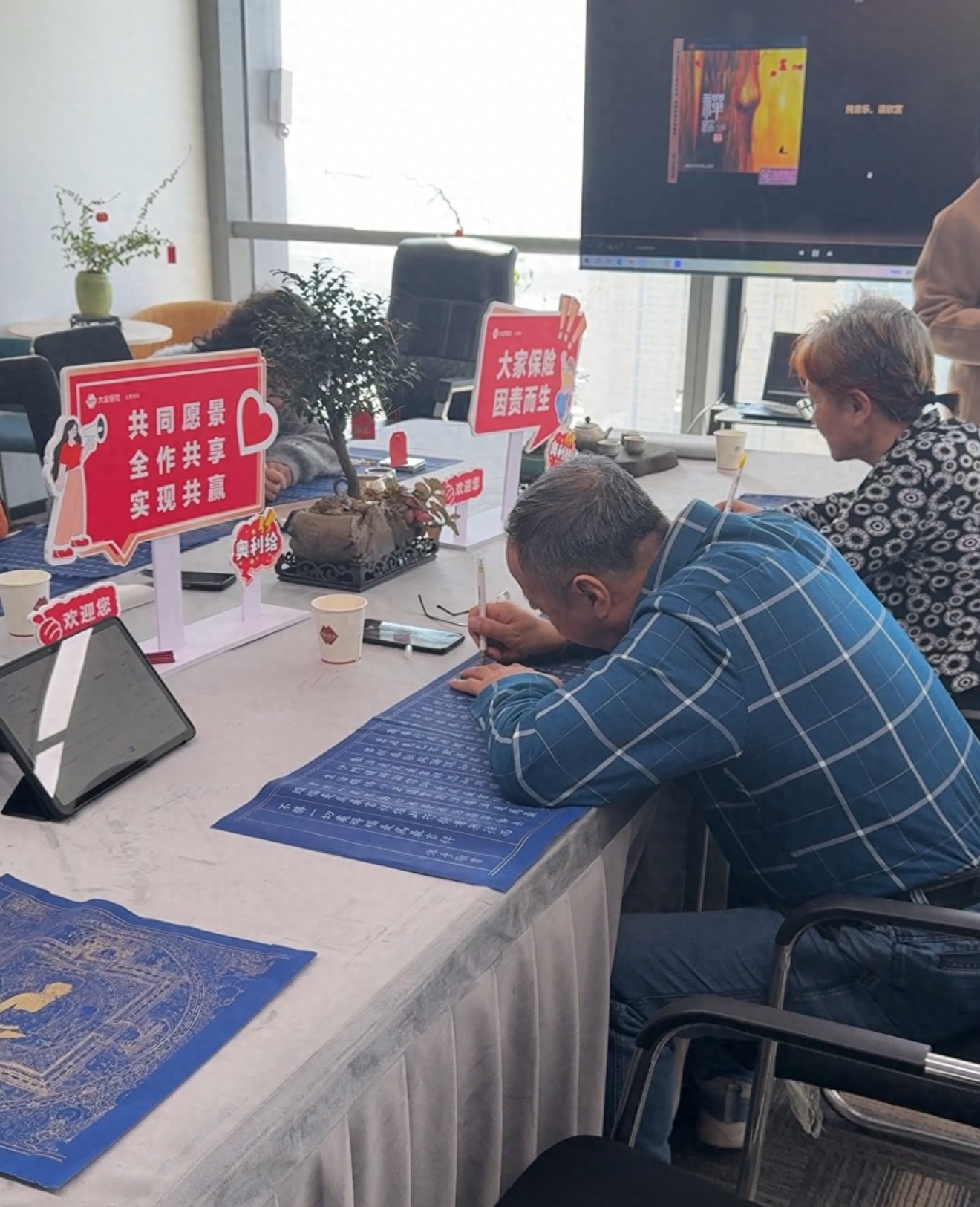 罗育燕的门店附近是王平的大家保险盛家专属代理店,他和助理正在组织客户进行书法活动。王平透露,与过去保险业金字塔型的营销结构不同,他的门店只有他和三位助理,但2024年实现标准保费达800万元。