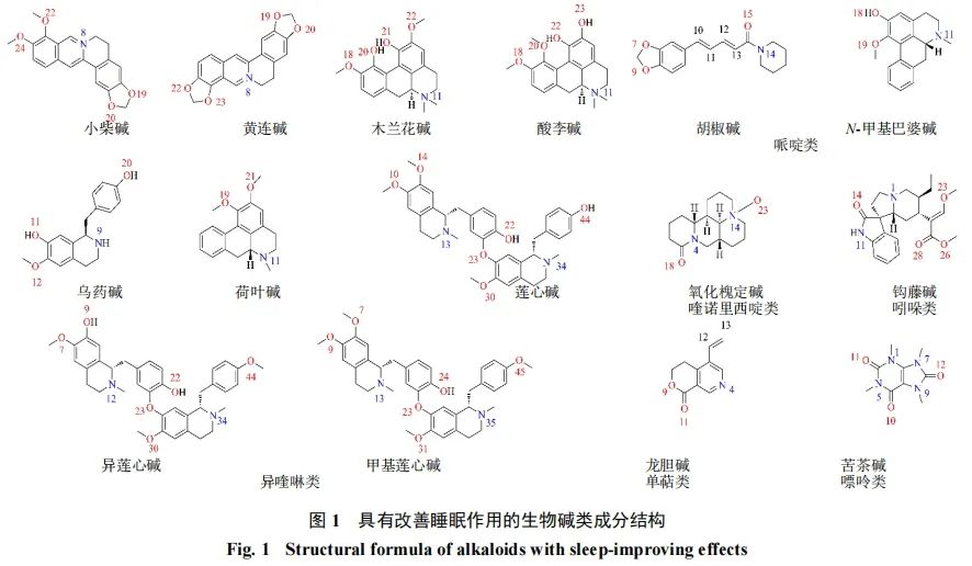 据文献报道,中药用于治疗失眠已有两千多年的历史,且中药中辨证施治的理念使其在临床上取得了良好的效果[7]。在中医看来,失眠症属于“不寐”,早在《难经·十六》便提出夜不得寐的原因是气血衰弱,而在之后的《伤寒论》《金匮要略》等著作中也提出了“虚劳虚烦不得眠”的论述[7]。总体而言,中医认为失眠多是因为情绪过度、饮食不调、久病体虚等导致心、脾、胆、肾等脏腑功能紊乱以及气、血、阴、阳失调[8]。基于此,近年来诸多学者将目光放在能影响这些脏腑的中药上,并成功从中分离出了有改善睡眠作用的化学成分,其中生物碱便是一类重要成分。