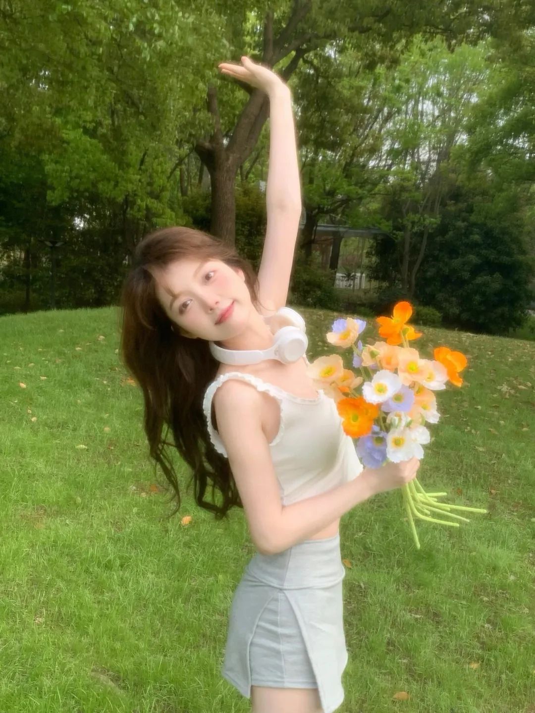 背对镜头坐下,双手撑着草地,双脚抬起屈膝或向前延伸。舒适自在的姿势,能营造一种慵懒随性的感觉,还能为画面留下十足的想象空间。为了增加照片的趣味性,我们还可以添加一些实用的道具,比如耳机、花篮等,让草地人像更生动有趣。