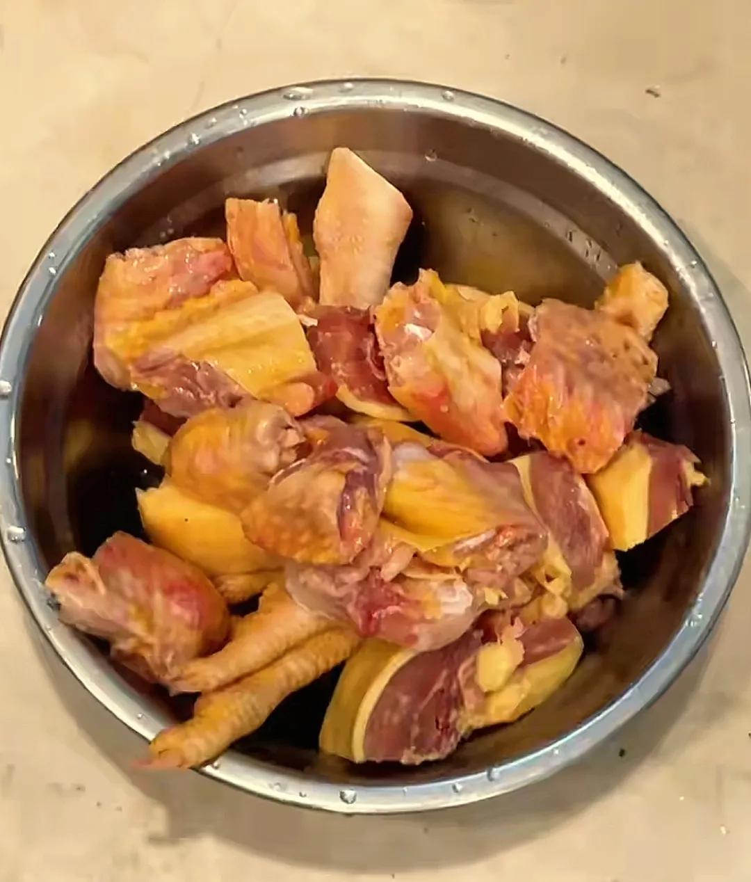 把鸡看好后,红姐也是直接冷水下锅,放了姜片,然后焯水,接着捞起来,才放到砂锅里面开始炖,炖汤红姐也是一股脑把鸡肉和料包一起放进去,然后等着熟就可以了。