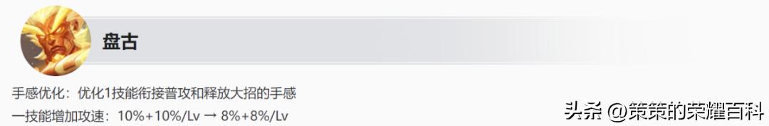 体验服优化了“新版”盘古,一技能衔接普攻与释放大招时的速度手感;同时,盘古一技能增加的攻速在基础、等级成长数值方面,均下调2%。