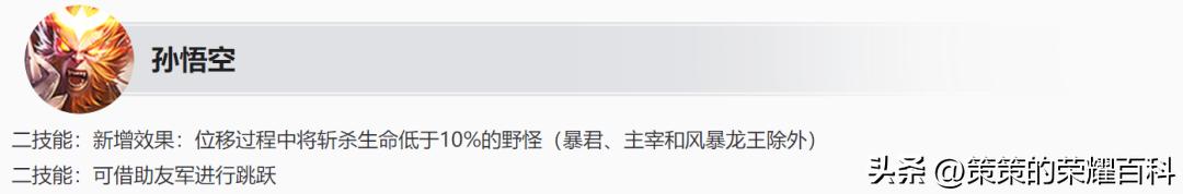 猴子二技能:在之前的体验服调整中,已经增加了可借助友军进行跳跃的机制;这一次,二技能新增了位移过程中,斩杀生命低于10%的野怪。