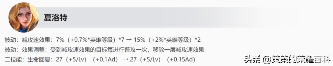 另外,夏洛特二技能生命回复效果提升了0.05Ad,而六段拉满就是0.3Ad。