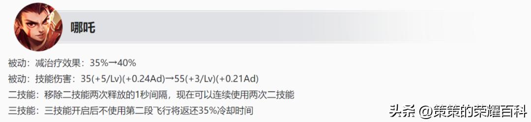 哪吒被动减治疗效果由35%提升至40%,更加限制具备回复能力的英雄;同时,被动灼烧调整了伤害结构,提升了前期基础伤害。