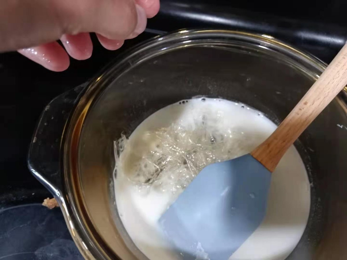 3,90克牛奶加入25克白糖,小火加热,加热到微微烫手即可关火。 把泡软的吉利丁放入牛奶中搅拌,片刻就完全溶解了。
