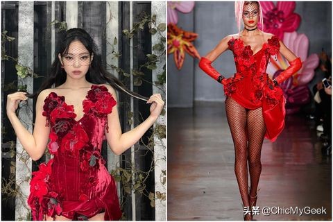 Mihano Momosa最标准的设计就是大红花,有出白色、粉色、红色等不一样的设计。原本是个浪漫的品牌,穿在JENNIE身上泼辣大胆,一反品牌常态。