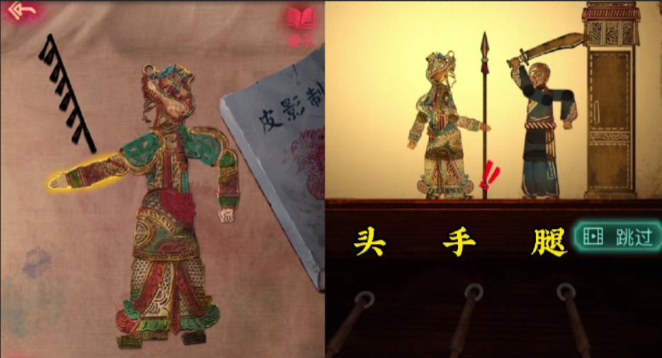 《奘铃村》最让我印象深刻的演出是一段皮影戏。游戏把戏曲的剧情和现实进行了逻辑互通。戏里主角被紧闭的大门挡住,我们就需要在外面的道具们上把“闭”字改写成“开”。当你操作主角在戏中打败反派,现实里阻挡玩家的恐怖纸人也会被破坏。