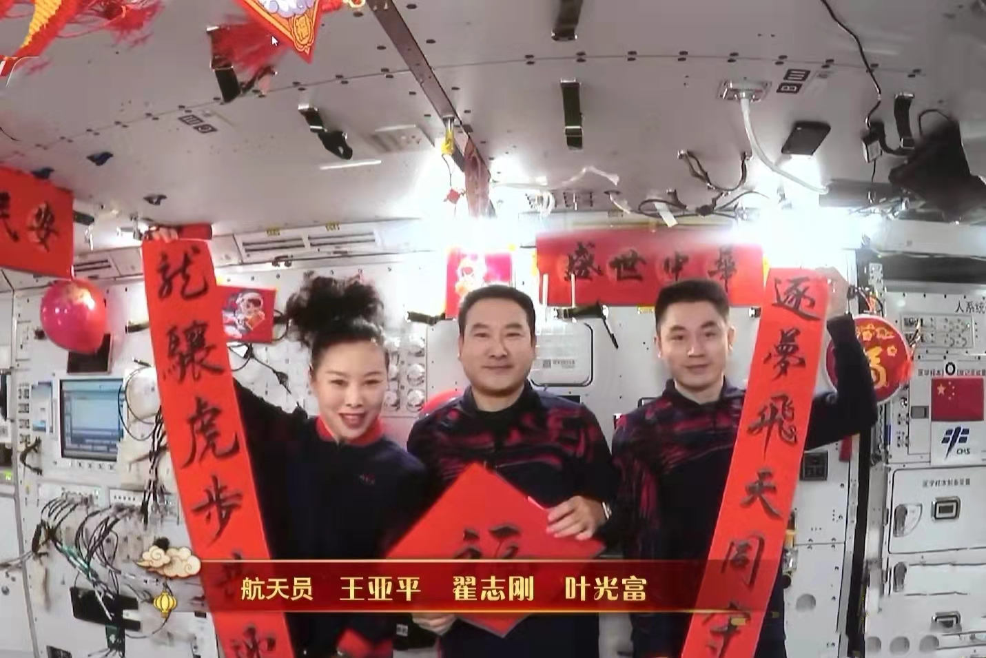 三个人手里拿着对联和福字,空间站里也全都是过年的装扮,看到这一幕,一种发自内心的自豪感油然而生。