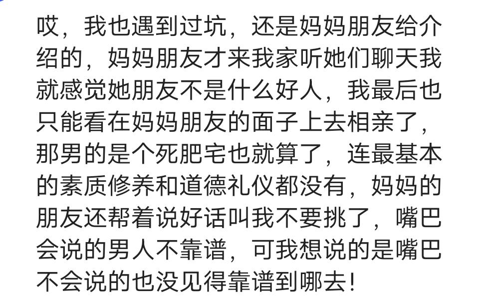 以前,我姑给我姐介绍相亲对象,真的是不管什么样的人都介绍,只要别人向她说说好话,请她吃顿饭!就把别人夸的像一朵花(其实是块豆腐渣),还有搞得我姐嫁不出去似的,他们一家人出动,她,她老公,她儿媳妇,她女儿都给我姐姐介绍相亲对象。