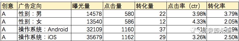 如下面的例子,我们同时设置两组AB测试组;分别测试性别和系统版本在同一创意下,转化率和点击率是否有显著差别。