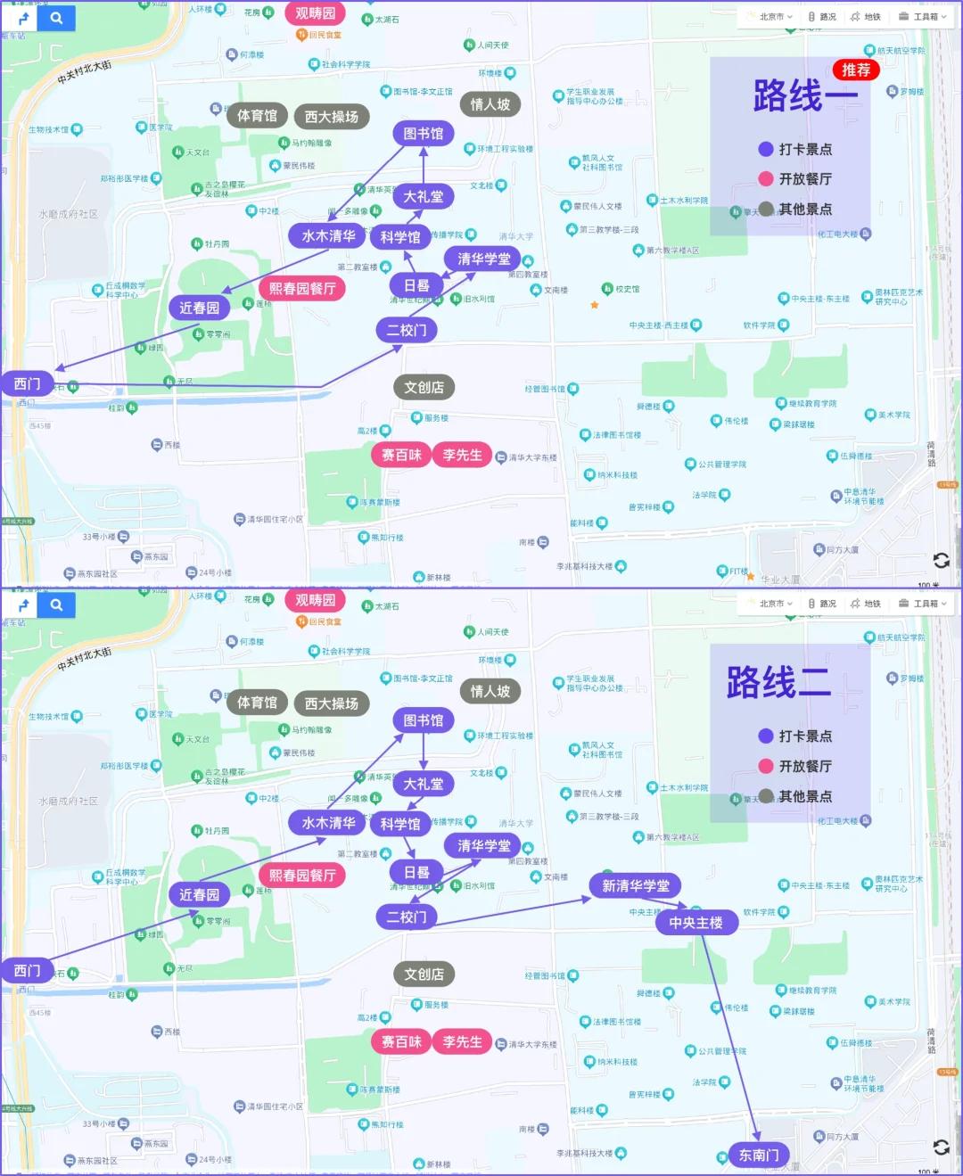北大东门—邱德拔体育馆—百周年纪念讲堂—北大书店—燕南园—静园—李大钊像—图书馆—博雅塔—未名湖—红楼—赛克勒考古艺术博物馆—蔡元培像—校史馆—勺海—北大西门—北大南门喜茶文创店
