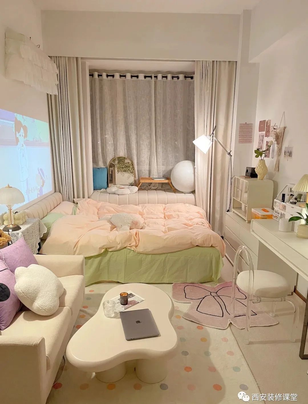 为什么都用纱帘?因为拍照好看,最重要的是空间视觉更浪漫,轻盈;只要采用具有隐私效果的纱帘没有什么不可;暖色的床铺靠边放置,发挥空间的最大价值;床尾绝对少不了斗柜置物架以及书桌兼顾化妆台,剩余空间就可以满足一个客厅功能