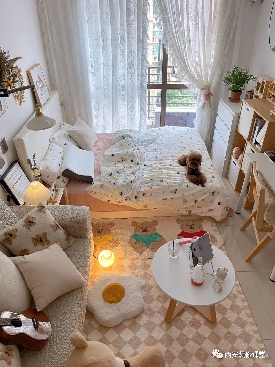 纯色暖白的布帘挂上,空间有了安全感;靠窗布局床铺,铺上非常柔软的床品,旁边空间小沙发小圆几,铺上好看的地毯,一个可爱的懒人沙发,满满的少女感以及温馨感