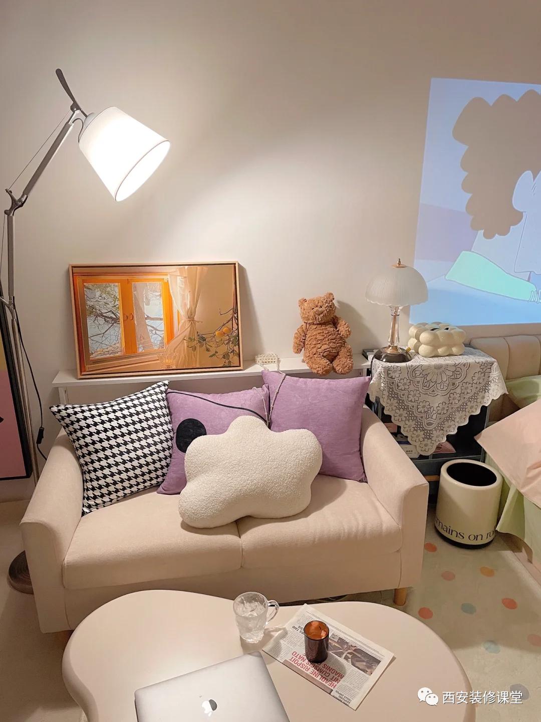 不要心疼电费了,多多放灯,没有光的卧室哪来的温馨感;床尾放个便携投影仪,一个人也可以窝在家里看大片