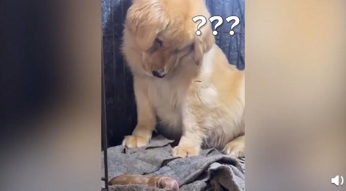 金毛初次产崽把自己吓一跳,满脸疑惑不敢相信,呆坐原地一动不动