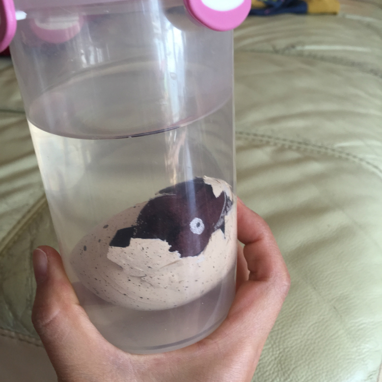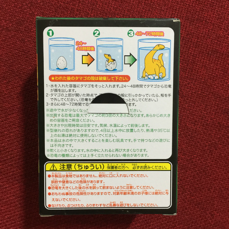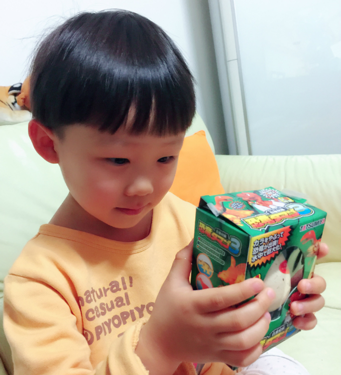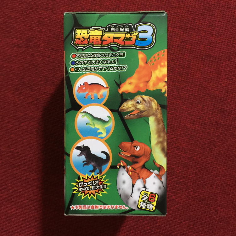 玩法很简单:把蛋放水里,会冒泡,过几天会自动孵化,恐龙很小,身上有黏液,和真的恐龙刚孵出一样,然后把它继续放水里,会吸水长大,黏液会慢慢消失,长到最大时,就可以把它拿出来玩,放外面会慢慢变小,把它再放水里就行了。