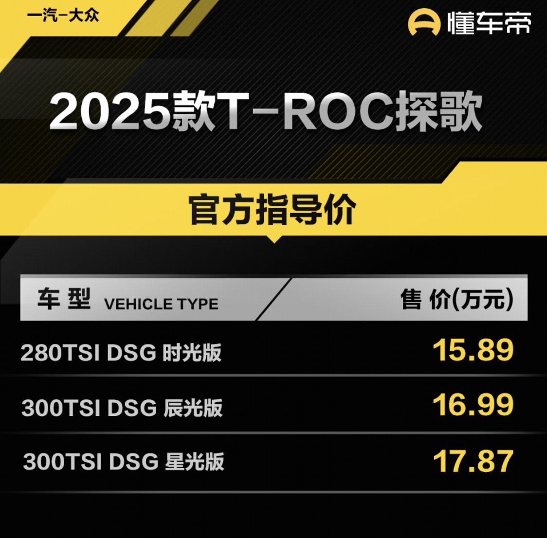 此次到店的车型为2025款大众T-ROC探歌280TSI DSG时光版,定位于入门版,指导价格为15.89万元。