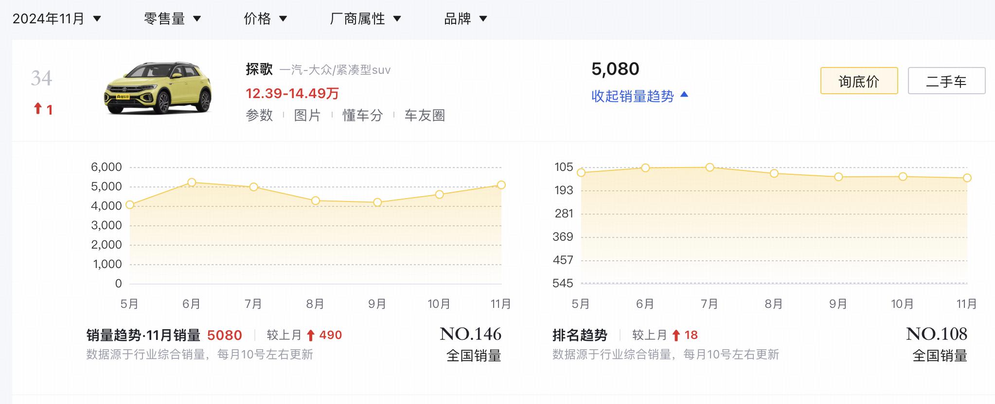 T-ROC探歌定位于紧凑型SUV,根据车型定位以及指导价格来看,同级车型有东风日产逍客(指导价格为12.59万-17.49万元)、广汽丰田锋兰达(指导价格为12.58万-18.48万元)等。根据销量数据来看,今年11月,T-ROC探歌销量为5080辆,销量在该级别排名第34位。更多消息,懂车帝将持续关注。