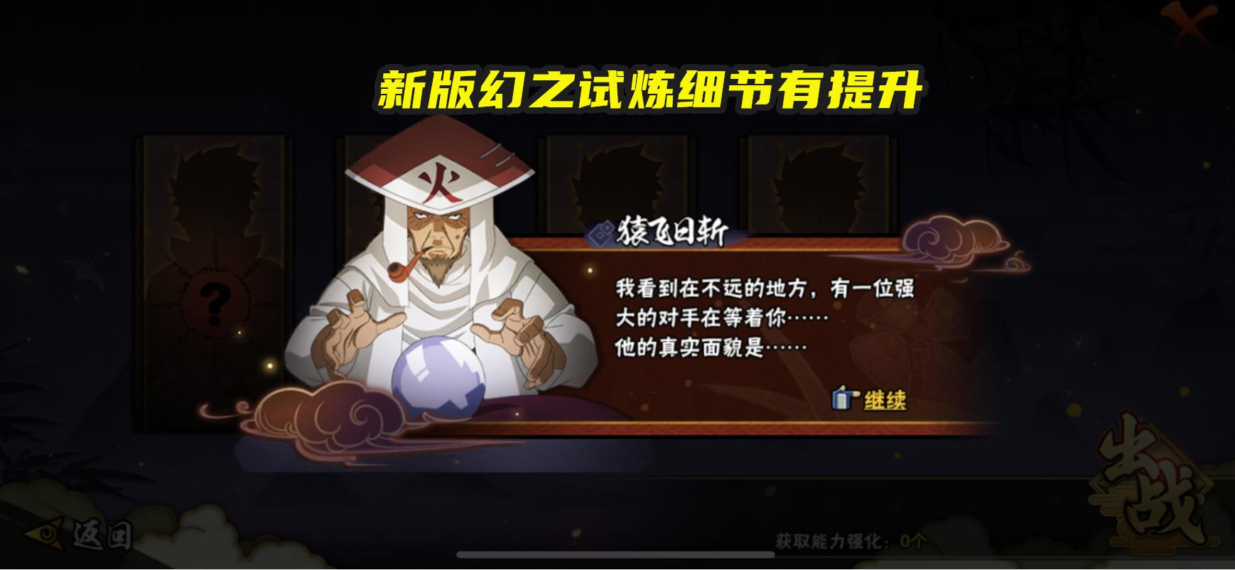 我先来说一下这次的幻之试炼的几个改动,首先在细节方面确实有一定的提升,比如在首次进入关卡的时候会提前告诉你第五关的BOSS是谁,而在之前,你需要通关第四关以后才能看到第五关的BOSS,很多玩家不太喜欢碰到地怨虞角都等忍者,这次可以提前看到BOSS以后,如果前面的关卡没有拿到的好的buff,再加上第五关的BOSS难度较大,那你可以直接结束重新再来。