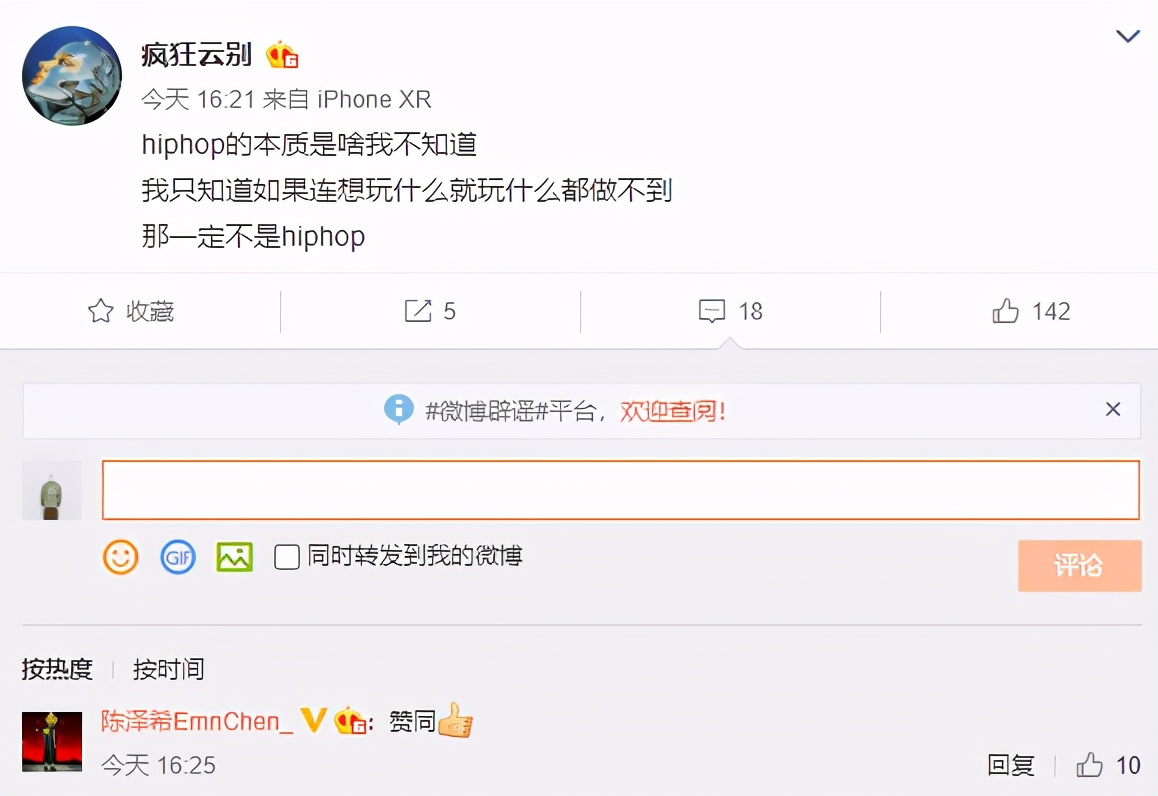 来自CSC的云别没有参与到讨论中,提出了不管本质是什么,自由表达的环境才是最重要的观点,陈泽希也在这条微博下表示认同。
