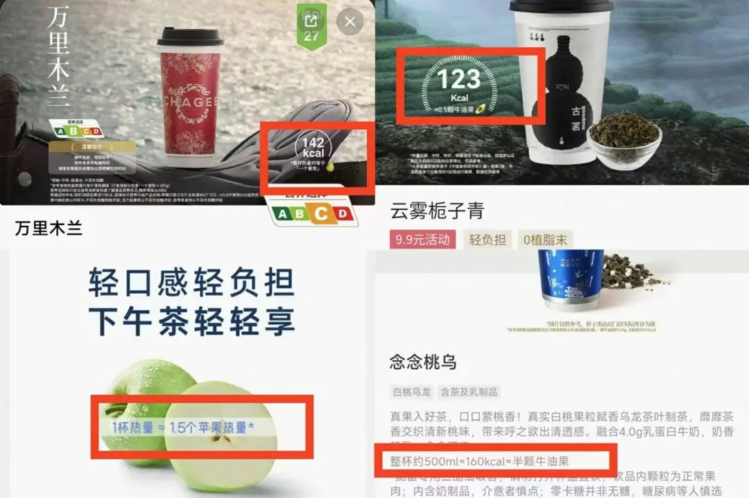 有些品牌为了更直接地展示热量“减负”的成果,将轻乳茶的热量换算成水果的热量:瑞幸的轻轻茉莉热量和1.5个苹果的热量差不多;古茗的云雾栀子青热量为123千卡,沪上阿姨的念念桃乌热量为160千卡,二者的热量约等于半颗牛油果。