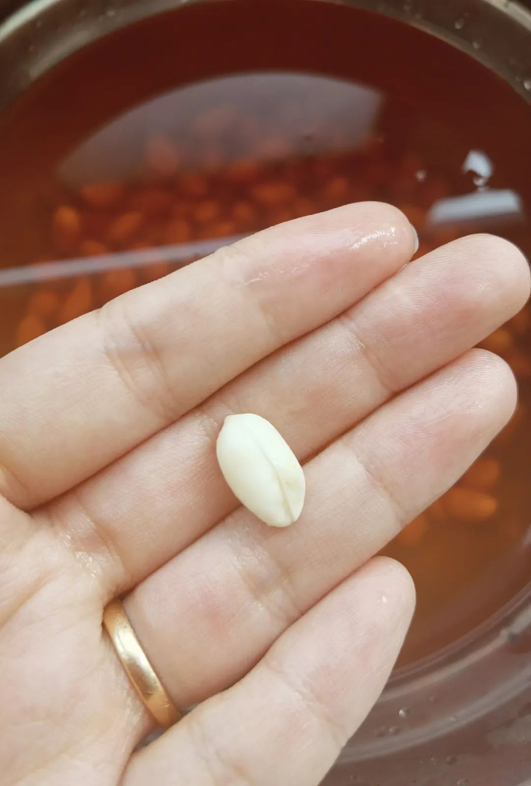 泡过水的花生很容易去皮,去皮时用手挤一下,花生仁自动就跑出来了。