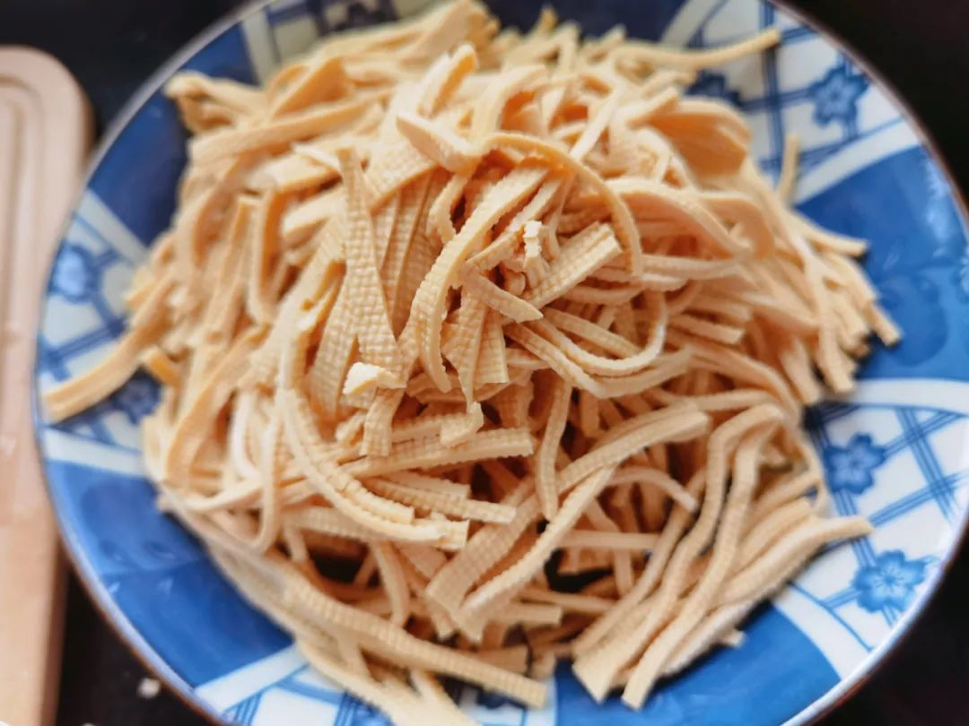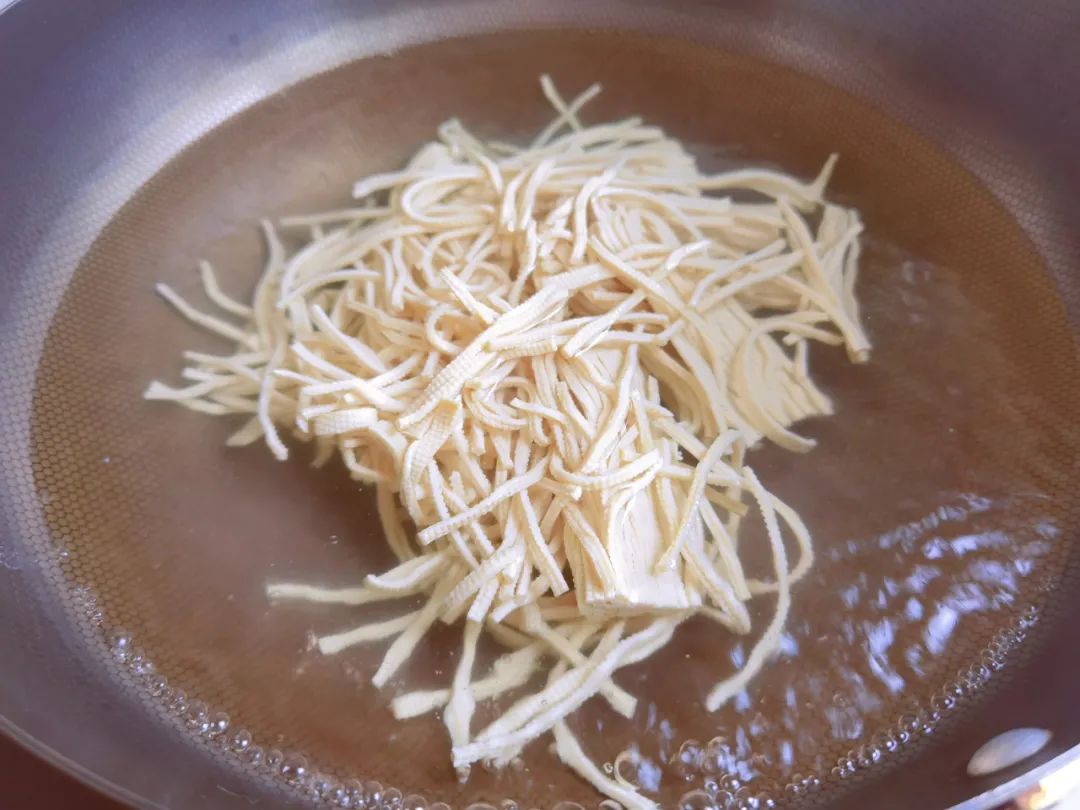起锅烧水,水量稍微多一点,水开后将豆腐丝下锅煮1分钟,捞起后过凉水。然后将花生仁也入锅煮1分钟,捞起后过凉水。
