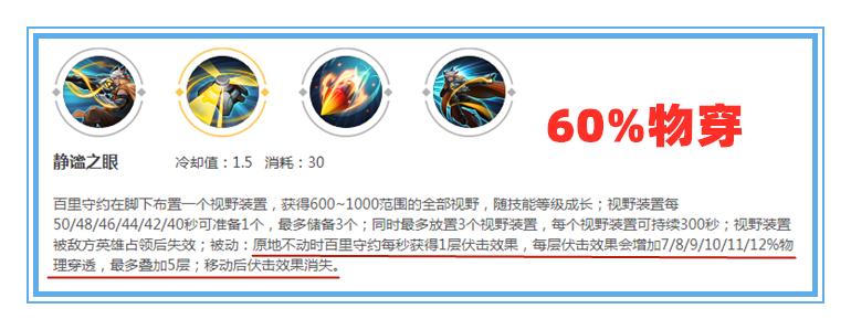百里守约的一技能被动每层可以增加12%的物理穿透效果,最高可以叠加5层。也就是说,保持原地不动的百里守约相当于自带60%的物穿。